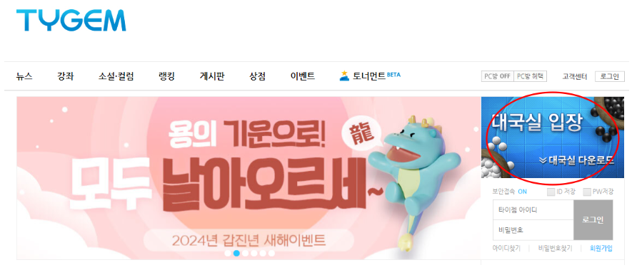 1. 회원가입 후 로그인을 합니다. '대국실 입장 대국실 다운로드 버튼을 누릅니다.