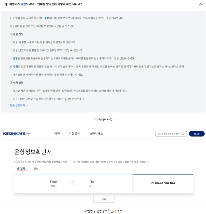 2) 보상 청구시 필요 서류 : 보상을 청구할 때는 항공권, 결항 확인서, 결제 내역 및 안내 문자 등이 필요하며 서류 제출 후 항공사에서 정해진 절창 따라 보상 여부가 결정됩니다.