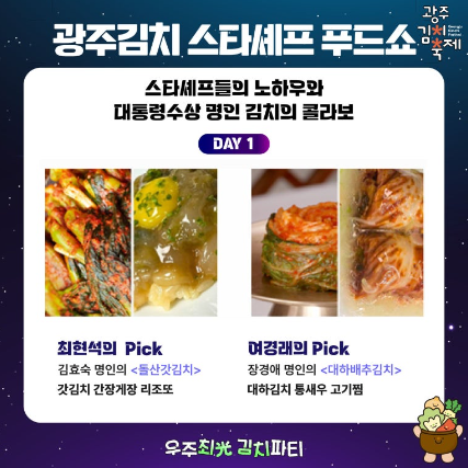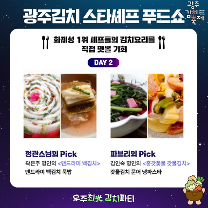 - 내용 : 광주김치에 대한 국내외 스타셰프 5인의 다양한 해석을 생생하게 경험할 수 있는 쿠킹 라이브쇼 / 대통령상을 수상한 김치명인의 김치와 다국적 요리 스타일이 결합된 색다른 김치요리 레시피 공개 / 푸드쇼 관람 후 음식 시식행사