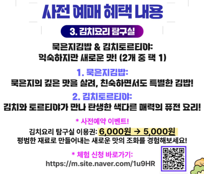 3) 김치 요리 탐구실 : 현장가 6,000원 => 사전예약가 5,000원