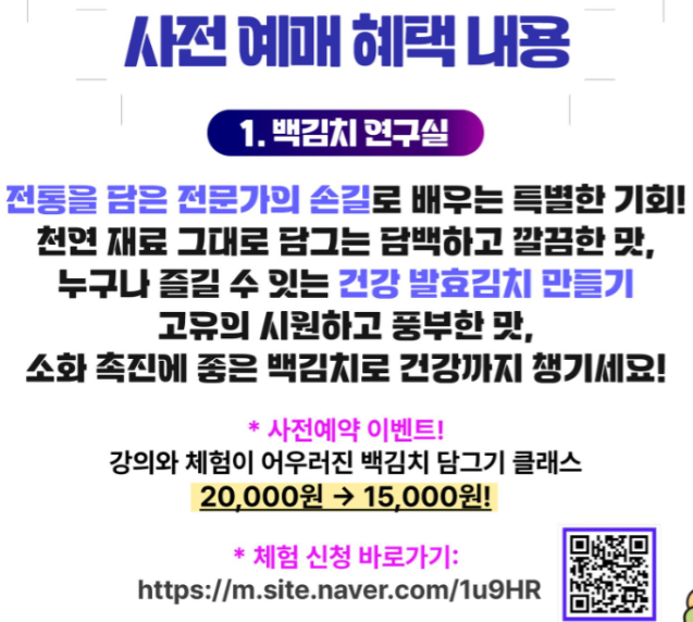 1) 백김치 연구실 : 현장가 20,000원 => 사전예약가 15,000원