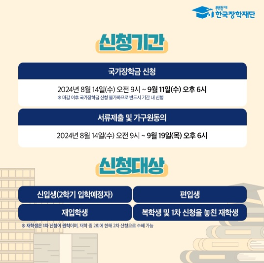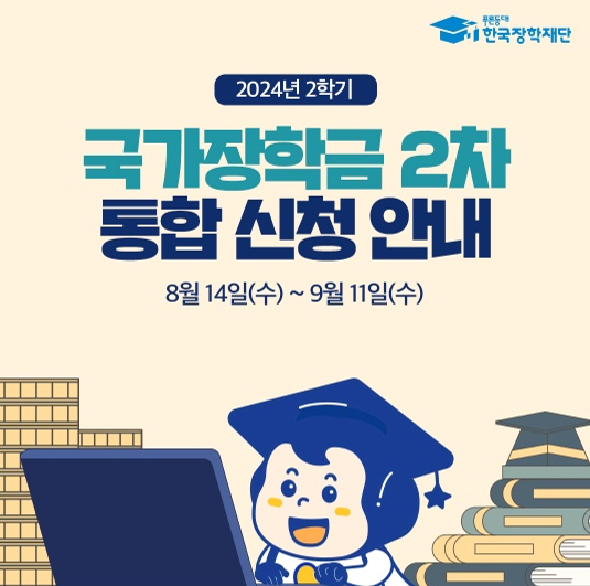 한국장학재단의 2024년 국가장학금 2차 신청이 시작되었습니다. 기간은 8월 14일(수)부터 9월 11일 (수)까지입니다. 대학생들의 경제적 부담을 줄여줄 중요한 지원금으로 이번 신청기간을 놓치면 신청이 불가하기에 반드시 기간 내에 신청하셔야 합니다. 나도 모르게 미루게 되면 혜택의 기회가 사라지니, 바로 신청하시기 바랍니다.