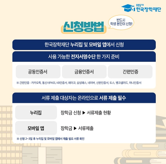 - 부모 또는 배우자 정보 제공 동의가 필요하며, 전자서명수단(인증서)을 통해 한국장학재단 누리집 또는 모바일 앱에서 동의 절차를 진행합니다.