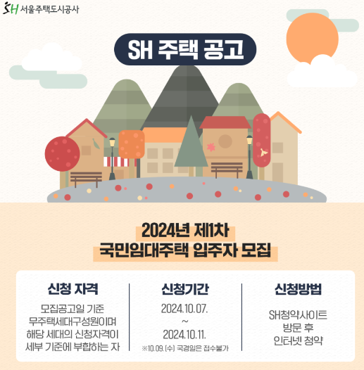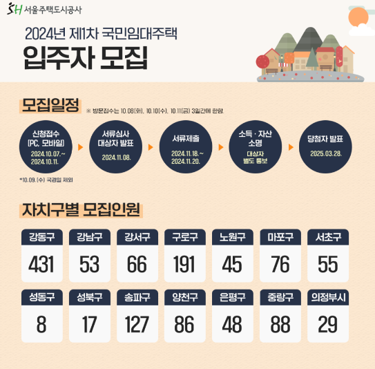 2024년 제 1차 국민임대주택 청약일정이 나왔습니다. 많은 분들이 기다리셨던 2024년 제1차 국민임대주택 모집 공고가 발표되었습니다. 청약 신청은 10월 7일(월) 부터 11일(금) 까지이니, 서울거주 무주택세대 분들은 내용 확인 후 빠르게 신청하시고 놓치는 일 없으시길 바랍니다.