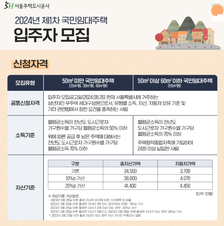 - 입주자모집공고일(2024.09.26.) 현재 서울특별시에 거주하는 무주택세대구성원으로서, 유형별 소득, 자산, 자동차 보유 기준 및 기타 관련법에서 정한 요건을 충족하는 사람