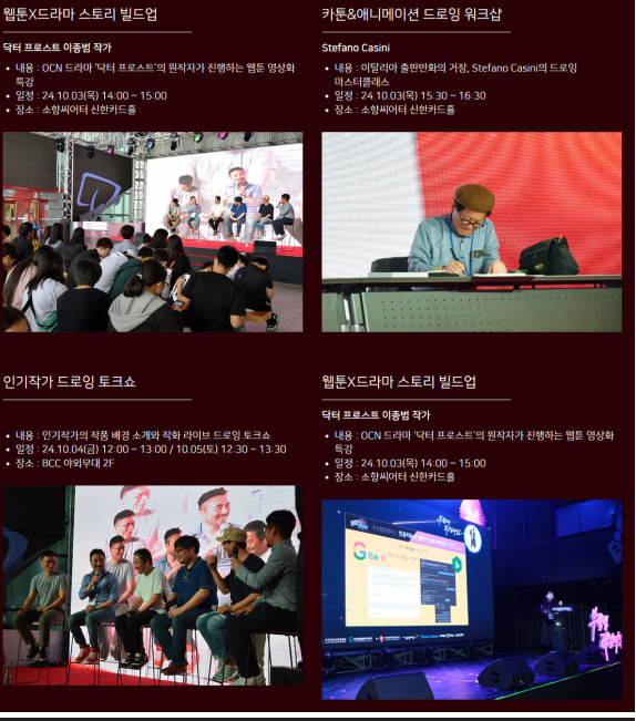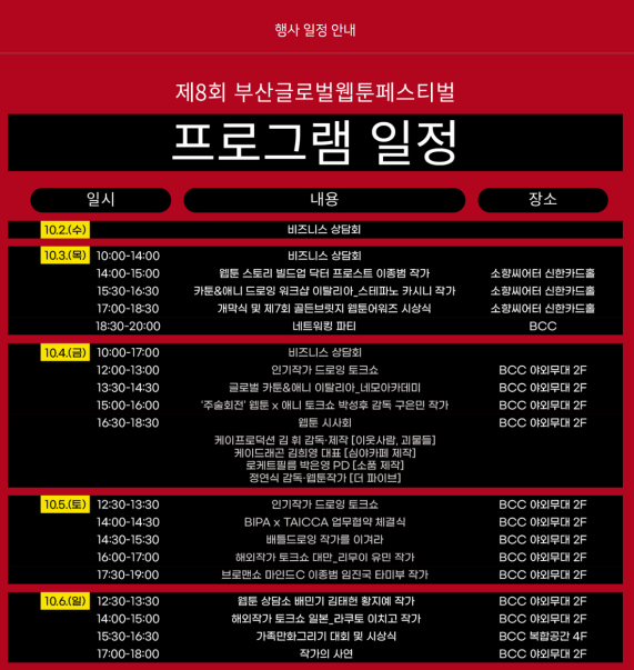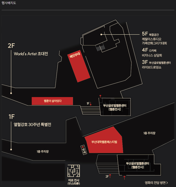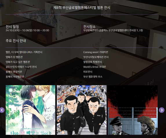 - 특별 전시: '열혈강호' 30주년 특별전, 부산 대학 웹툰학과 학생 작품전 등.