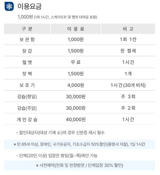 - 1회 1시간 1,000원 : 입장 및 헬멧, 스케이트 대여료 모두 포함