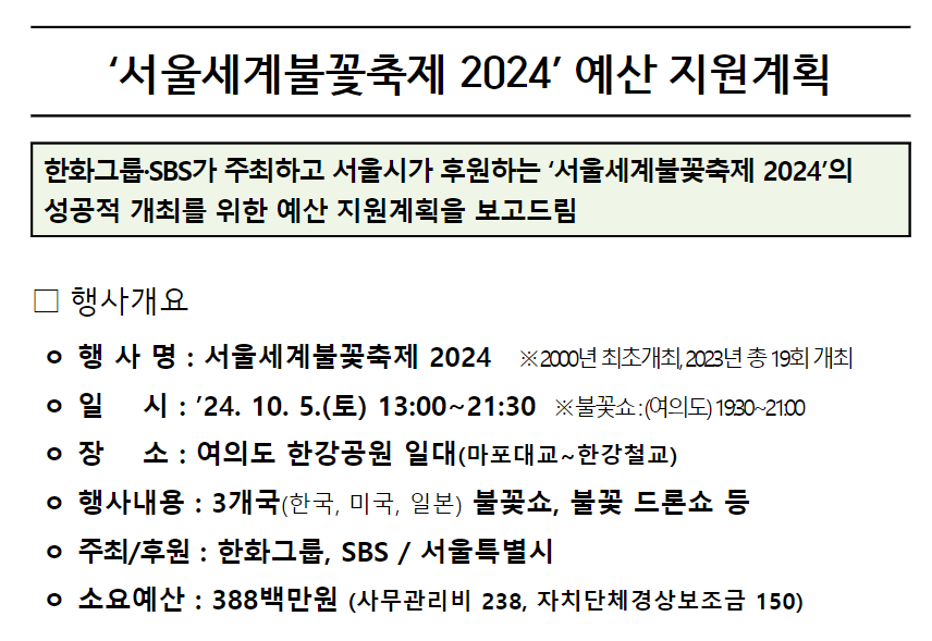 이번 2024년 서울세계불꽃축제는 20주년을 맞이하여 더욱 화려하게 진행될 예정입니다.