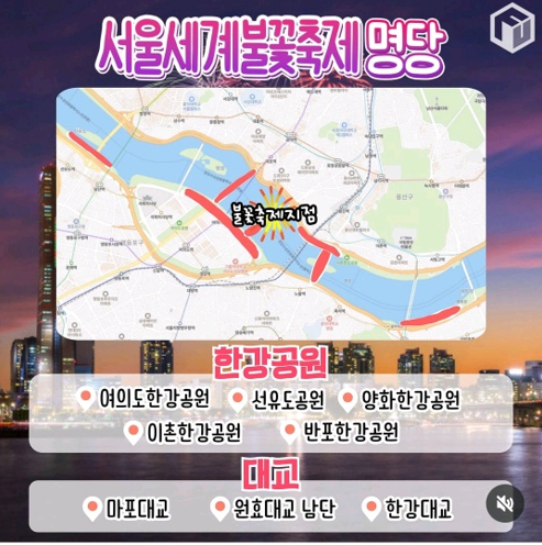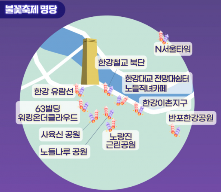추천드리는 명당은 축제 장소인 여의도 한강공원보다 덜 붐비는 숨은 명당이며, 최근 SNS를 통해 인기를 끌고 있는 이 명당에서 비교적 조용하게 불꽃축제를 즐기실 수 있습니다.