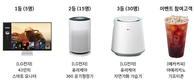 이벤트 경품 : LG 스마트 모니터, LG 공기청정기, LG 가습기, 커피 기프티콘