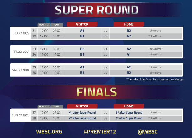- Super Round (슈퍼라운드 / 11월 21일 ~23일) :일본 도쿄돔에서 진행되며, 조별리그 상위 2개 팀이 진출하여 대결합니다.