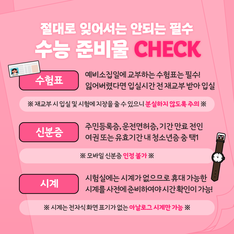 2025학년도 수능이 도래하였습니다. 수능 예비소집일은 2024년 11월 13일이며, 시험 당일인 2024년 11월 14일에는 반드시 오전 8시 10분까지 시험장에 도착해야 합니다. 정확한 시간에 도착하는 것은 누구나 아는 기본 중의 기본입니다. 시험에서는 수험번호가 부착된 좌석에 앉아야 하므로 미리 준비해두어야 할 것이 많습니다. 시험 일정과 준비물에 대한 자세한 내용은 아래의 이미지를 참조하면 좋습니다.