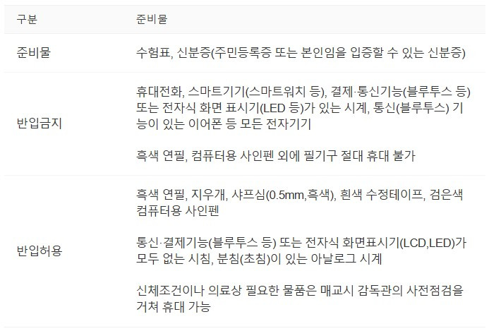 - 개인 물품 - 필기구 외의 반입 금지 물품은 철저히 확인.