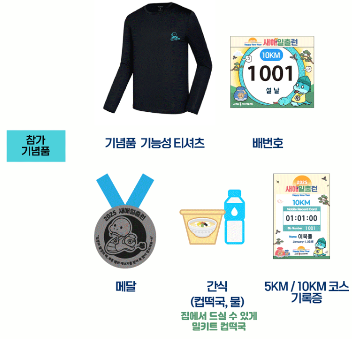참가자에게는 기능성 티셔츠, 배번호, 메달, 간식(밀키트컵떡국), 기록증 등의 기념품이 제공됩니다. 또한, 각 코스별 우승자에게는 상장과 함께 시상품이 지급되므로, 경쟁이 치열할 것입니다. 이는 참가자들에게 더욱 큰 동기를 부여할 것입니다. 대회를 통해 얻는 성취감은 여러분의 새해 목표를 세우는 데에도 큰 도움이 될 것입니다.
