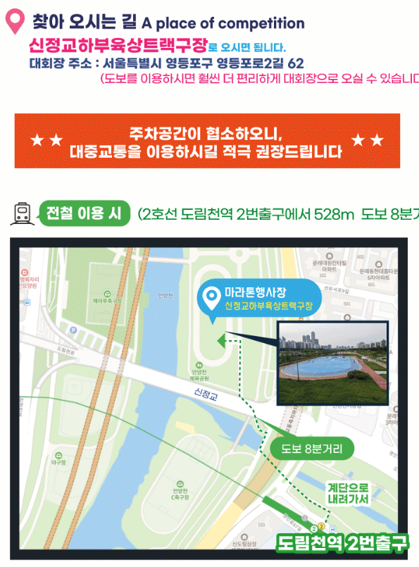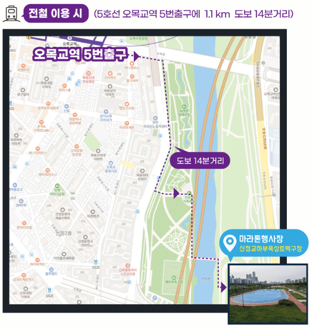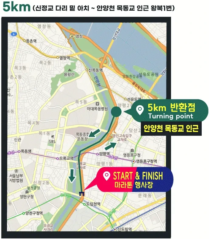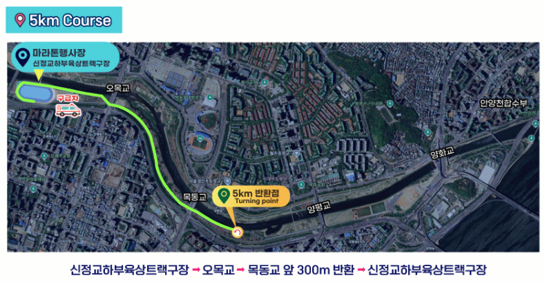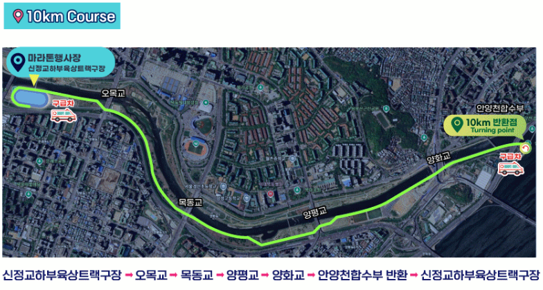 대회는 5km와 10km 두 가지 코스로 진행됩니다. 5km 코스는 초보자와 가족 단위 참가자에게 적합하며, 10km는 보다 도전적인 코스를 원하시는 분들에게 추천합니다. 각 코스의 시작과 끝은 신정교 하부 육상 트랙구장으로, 경로는 잘 정비되어 있어 안전하게 달릴 수 있도록 마련되어 있습니다.