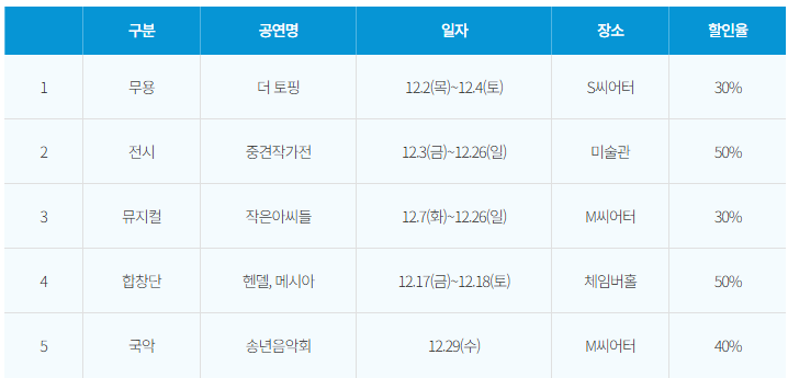 서울시무용단 ‘더 토핑’, 전시 ‘중견작가전’, 서울시뮤지컬단 ‘작은아씨들’, 서울시합창단 ‘헨델,메시아’, 서울시국악관현악단 ‘송년음악회’에 30~50%의 수험생 할인이 적용됩니다.